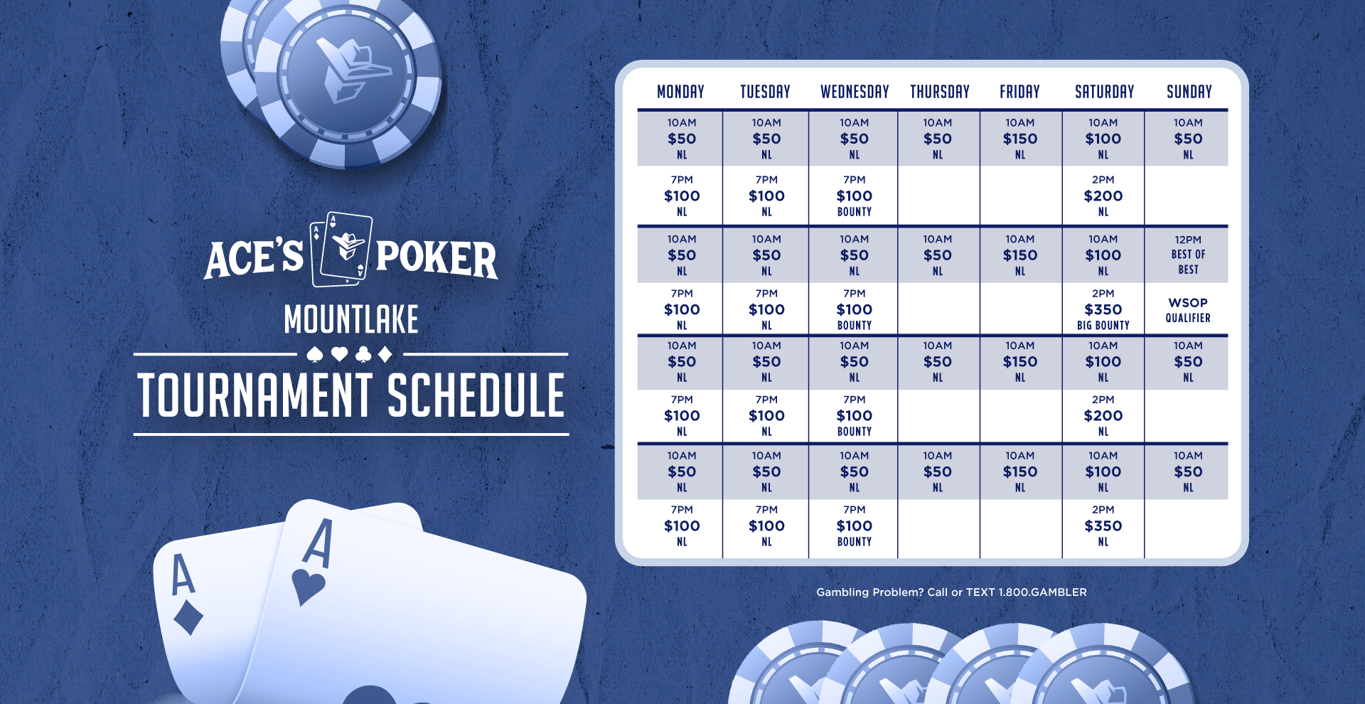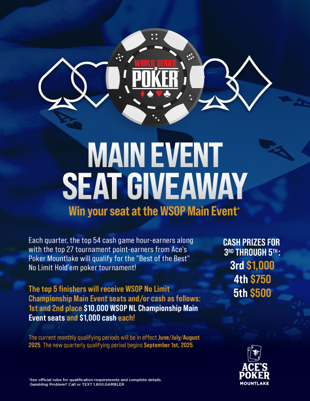 The top 54 cash game hour-earners and top 27 tournament point-earners each quarter qualify to compete in a NL Hold’em poker tournament. The top two finishers receive $10,000 WSOP NL Championship Main Event seats and $1,000 each! 3rd through 5th place receive $1,000/$750/$500 each! Quarterly qualifying period begins September 1st, 2025. Contact Poker Room for complete details.